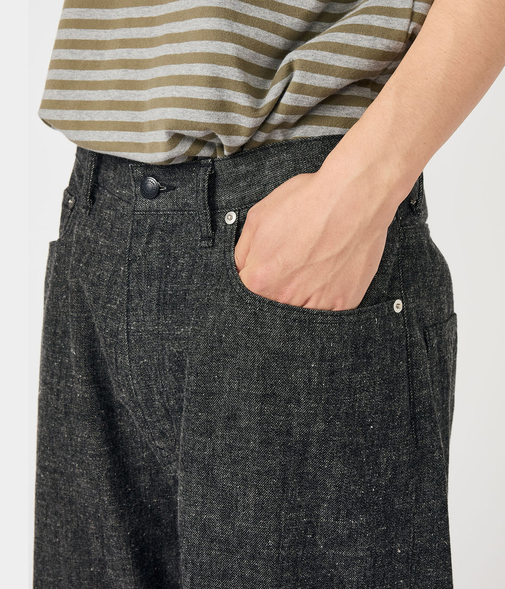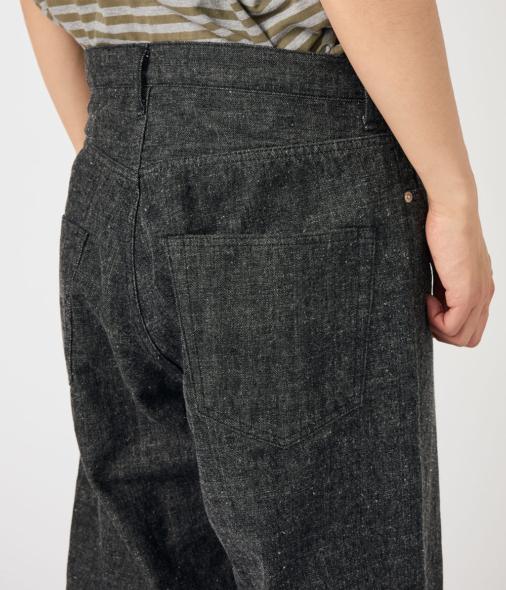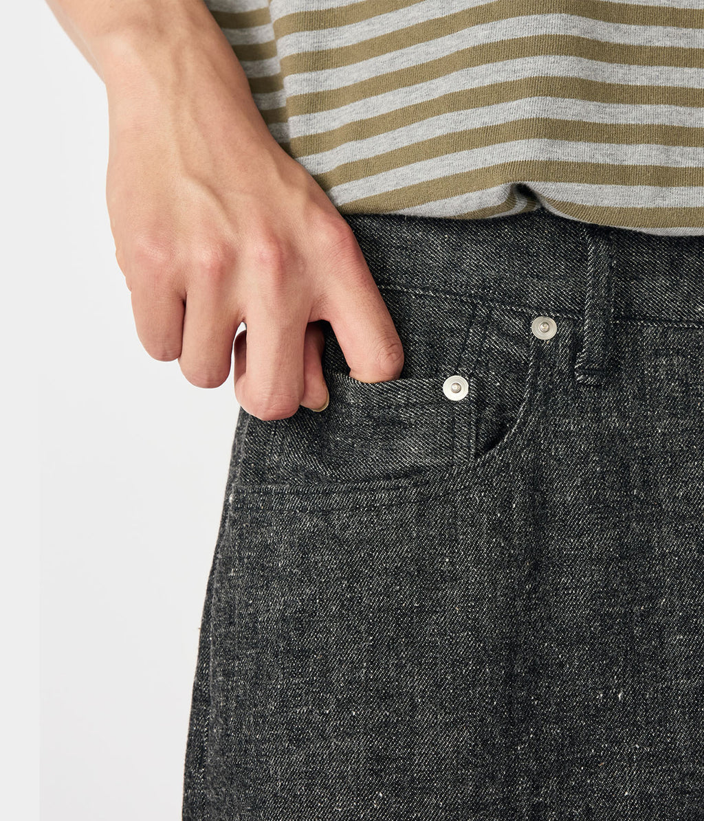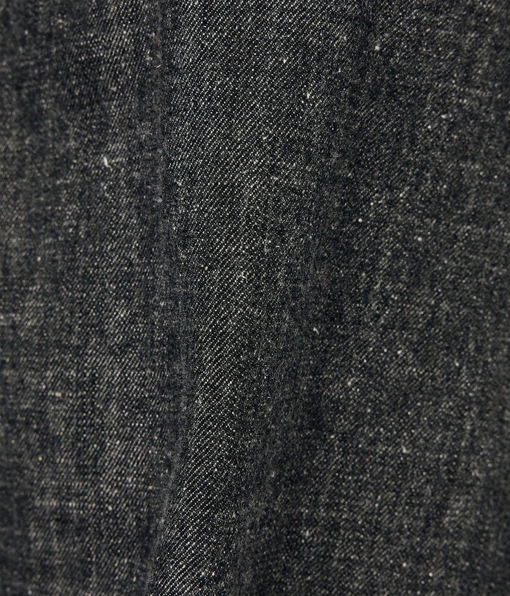 ・リサイクルポリエステルの外側をコットンで覆った太番手のムラ糸を独自で開発し、ロープ染色にて染色。この糸をタテ糸に使用し、ヨコ糸にはヴィンテージ感のある太番手のコットンネップ糸を使用。