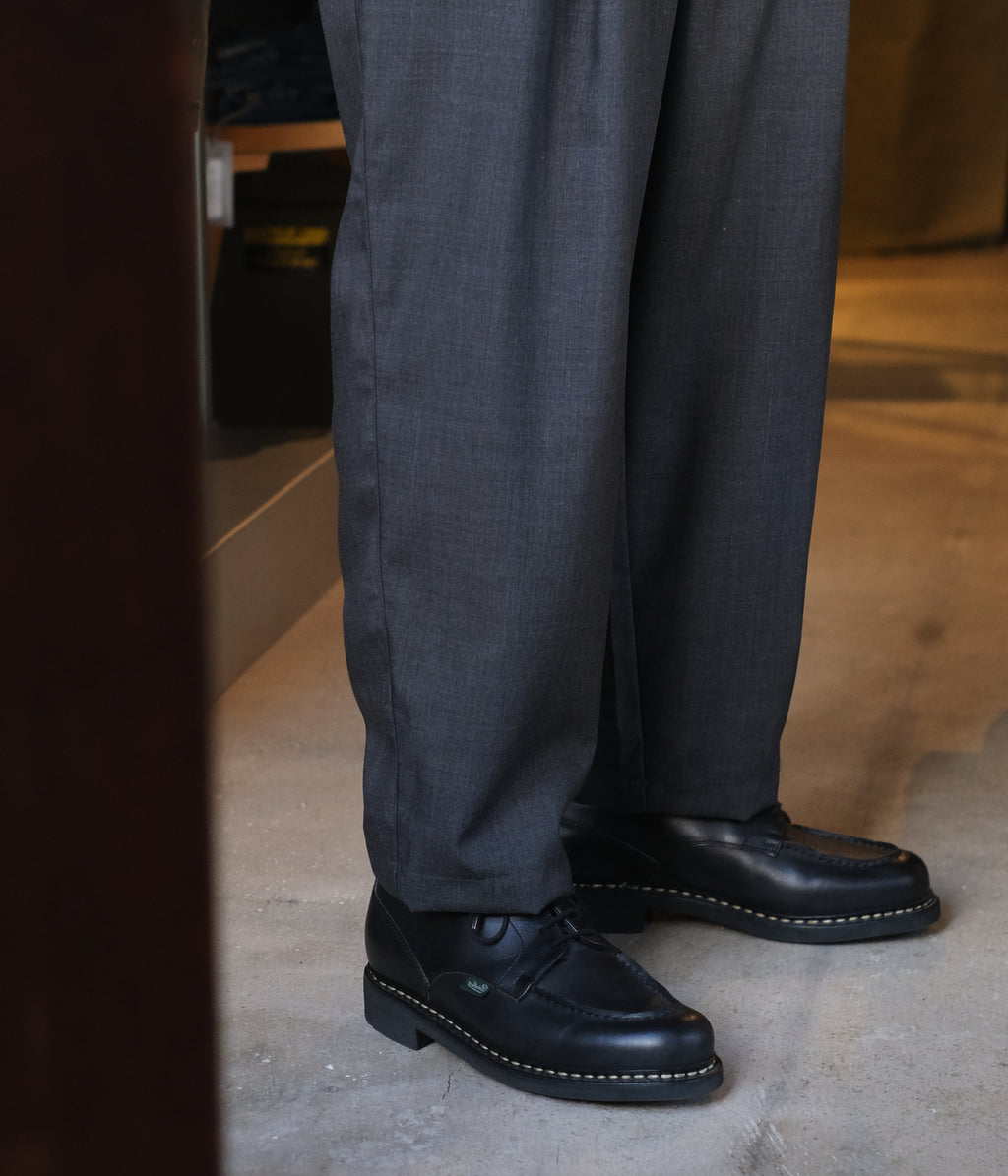 高級素材ですがあえて綺麗なスラックスにせずあえて遊びのある、きついテーパードシルエットにしました。